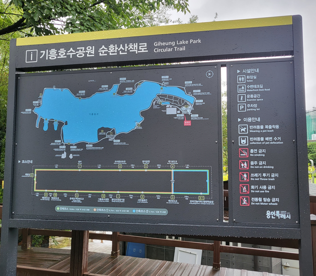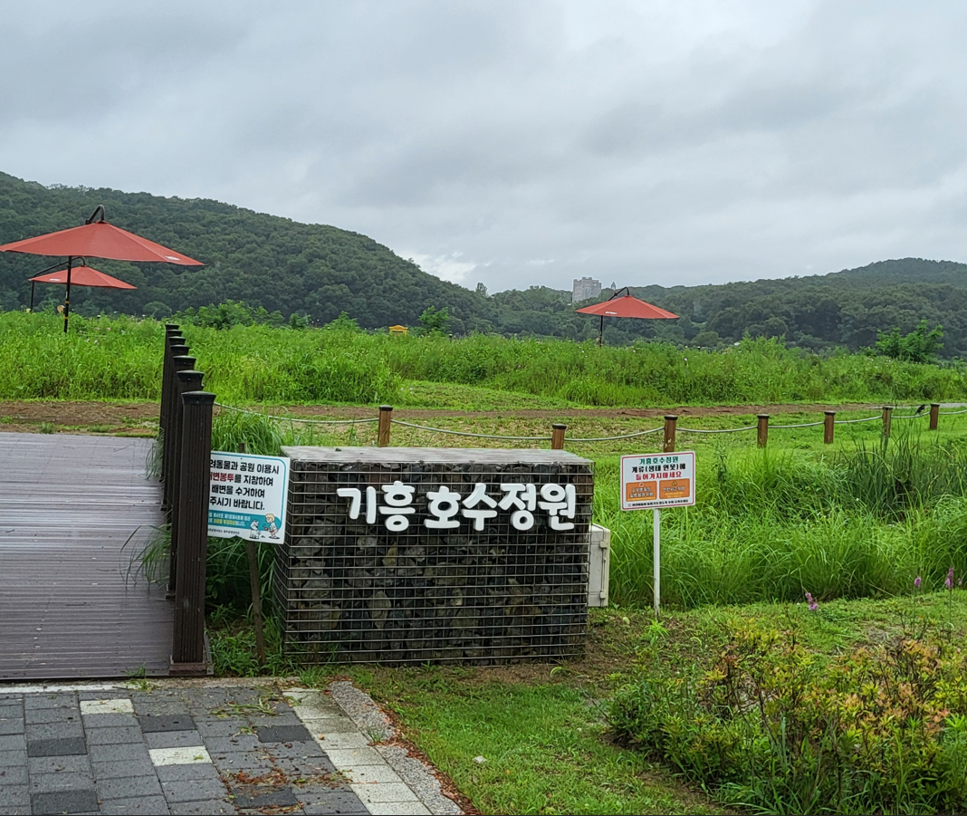 습관적으로 한주일에 딱 하루 바깥바람을 좀 피우려고 만보걷기를 위해서, 비가 내리는 오늘 7월 19일에는 기흥호수공원(器興湖水公園)을 찾았다. 이곳은 기흥호수 주변을 따라 10km 산책로가 조성되어 있다. A코스는 10㎞ 거리로 도보 3시간 30분, B코스는 8.7㎞ 거리로 도보 3시간 5분, C코스는 2.1㎞ 거리로 도보 약45분이 소요된다. 기흥호수는 특히 호숫가 노을이 아름다워 노을 명소로 사랑받고 있는 곳이다.