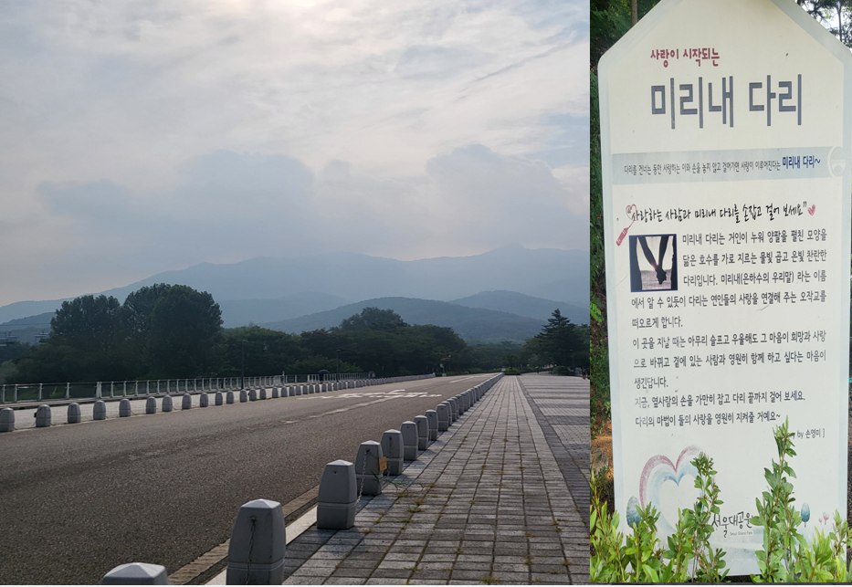 미리내 다리 모습이다. "미리내 다리는 거인이 누워 양팔을 펼친 모양을 닮은 호수를 가로 지르는 물빛 곱고 은빛 찬란한 다리 미리내(은하수의 우리말)에서 알 수 있듯이 다리는 연인들의 사랑을 연결해 주는 오작교를 떠 오르게 한다. 이곳을 지날때는 아무리 슬프고 우울해도 그 마음이 희망과 사랑으로 바뀌고 곁에 있는 사람과 영원히 함께 하고 싶다는 마음이 생긴단다. 지금, 옆 사람의 손을 가만히 잡고 다리 끝까지 걸어 보시라. 다리의 마법이 둘의 사랑을 영원히 지켜줄 것이다."