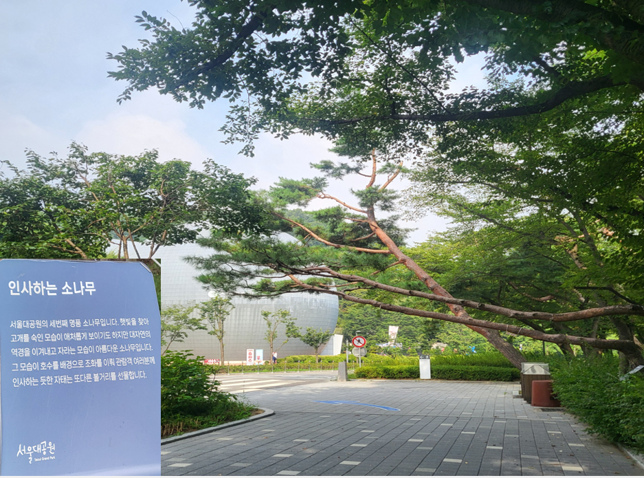 천천히 걸으며 사색하기에 참 좋은 호숫가둘레길 입구에서 첫번째 만나는 '인사하는 소나무'의 모습이다. "서울대공원의 세번째 명품소나무로 햇빛을 찾아 고개를 숙인 모습이 애처롭게 보이기도 하지만, 대자원의 역경을 이겨내고 자라는 모습이 아름다운 소나무다. 그 모습이 호수를 배경으로 조화를 이뤄 이곳을 지나는 관람객들에 인사를 하는듯한 자태는 또 다른 볼거리를 선물한다."