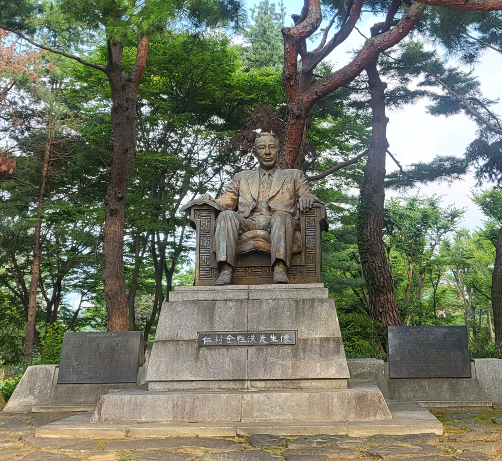 그 옆에는 인촌(仁村) 김성수 선생의 동상이다. 그는 1891년(고종 28년) 10월 11일 전라북도 고창에서 만석/군의 아들로 태어났다. 한국의 정치가·교육자·언론인이며, 경성방직회사 창설, 동아일보 창간, 보성학교 인수 등의 활동을 하였다. 1951년 2대 부통령에 취임하였으나 사임하였다.