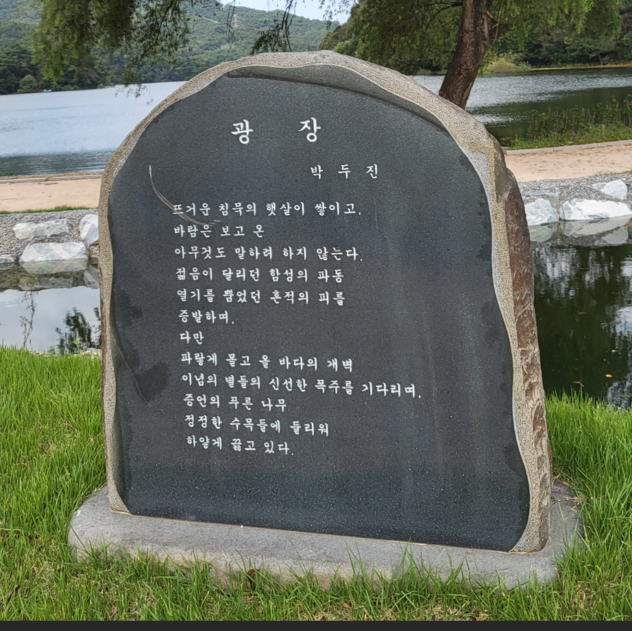 1,000여 편의 시와 400여 편의 산문을 남긴 청록파 시인 혜산 박두진의 고향이 이곳 안성이다. 안성에 있는 금광호수를 바라보며 걷는 산책길에 박두진 문학길인 청록뜰이 있다. 산책길로 들어서면 시인의 동상을 시작으로 산책길 중간중간에 시인의 시가 걸려있다. 호수 위의 테크 길은 호수 위를 걷는 듯한 느낌이다. 걷다 보면 시인이 된 듯한 착각에 빠지게 된다. 걷다가 쉴 수 있도록 곳곳에 벤치가 있어서 벤치에 앉아 시인의 시를 감상해도 좋다.