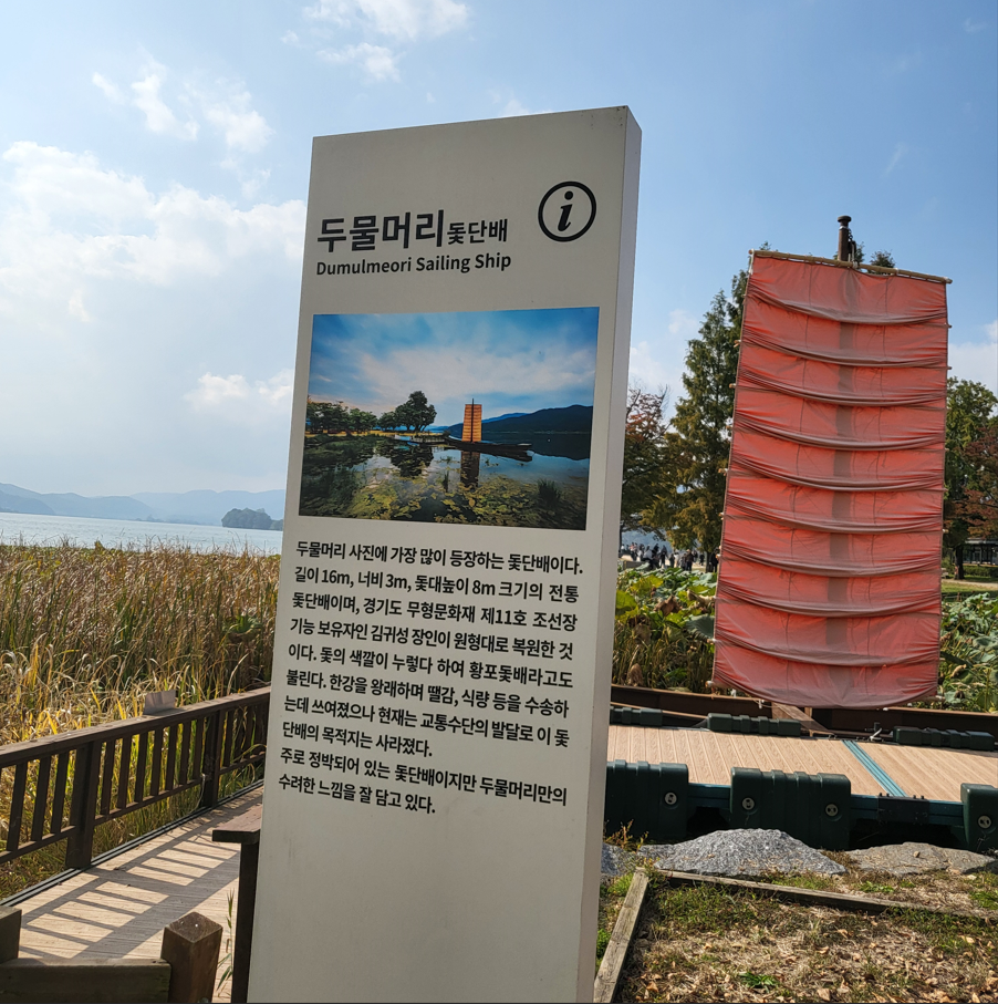 두물머리의 상징인 느티나무 앞 강가에는 두물머리 돛단배 황포돛배도 여전히 떠 있다. 지금은 실제 운항을 하지는 않지만, 배 자체가 풍경의 일부가 되어 사진 한 장에도 깊은 감성을 불어 넣는다. 길이 16M, 너비 3M, 돛대높이 8M의 크기인 돛단배는 경기도 무형문화재 제11호 조선장 기능 보유자인 김귀성 장인이 원형대로 복원한 것이다.