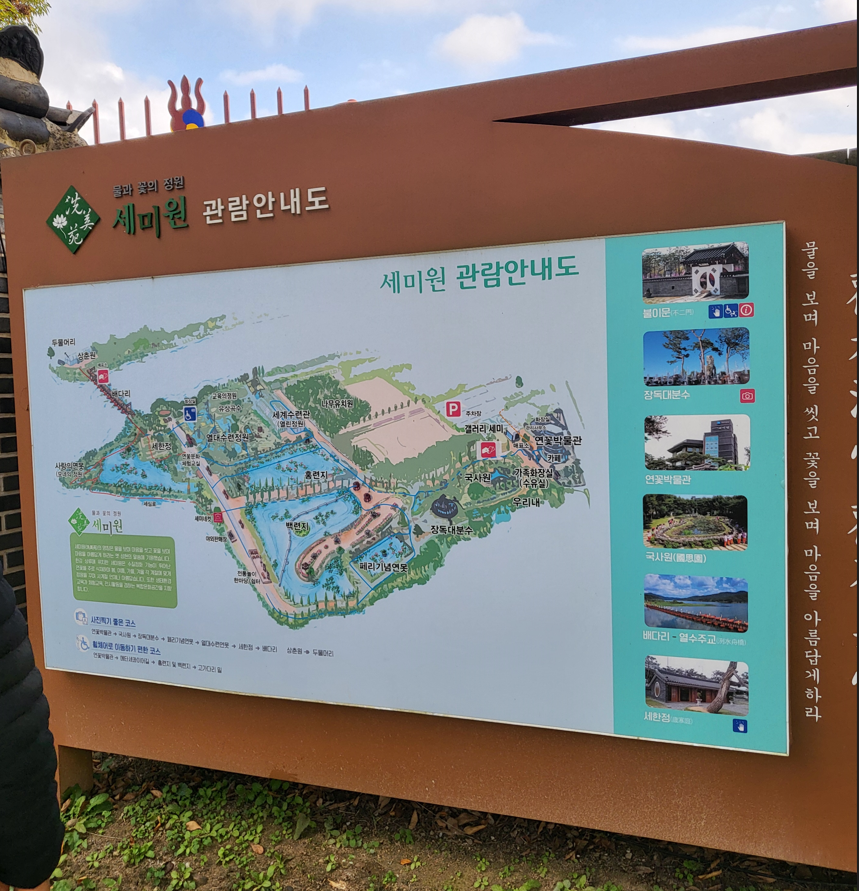유료공원인 세미원의 관람안내도이다. 이곳에는 불이문, 장독대분수, 연꽃박물관, 국사암, 배다리, 세한정이 소개되어 있지만, 그래도 자랑거리는 뭐니뭐니해도 연꽃이다. 여름이면 사람 키만큼 자라올라 연못을 가득 메운 큼지막한 연꽃들이 연못을 화려하게 수놓는다. 물의 정원에서 펼쳐지는 연꽃향연을 지금은 볼 수 없고, 넓고 파아란 연잎들만 가을바람에 맞춰 살랑살랑 춤을 추고있다.