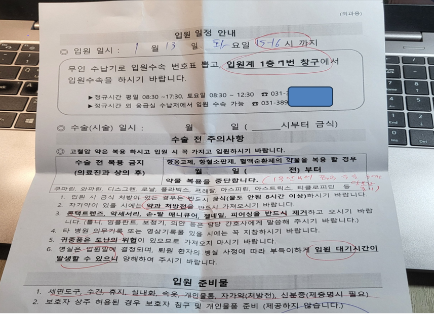 70세 이후에는 수술을 받기위해 전신마취가 필요하며, 전신마취를 위해서는 순환기내과와 호흡기내과등의 협진이 필수라며 건강검진을 먼저 하란다. 입원을 위하여 세시간의 신체검사를 모두 받은 후, 부비동염과 비밸브재건을 위한 3박4일의 입원실로 들어왔다.