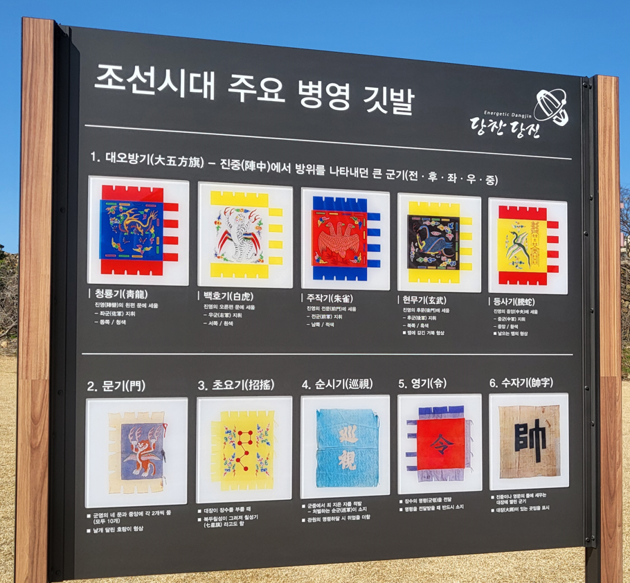 성벽위에서 나부끼는 병영 깃발들의 오색 모습이 아름답다. 대오방기는 진중에서 방위를 나타내던 큰 군기로 청룡기, 백호기, 주작기, 현무기, 등사기가 있으며, 문기, 초요기, 순시기, 영기, 수자기 등에 대하여 안내판에 자세히 기록하고 있다.